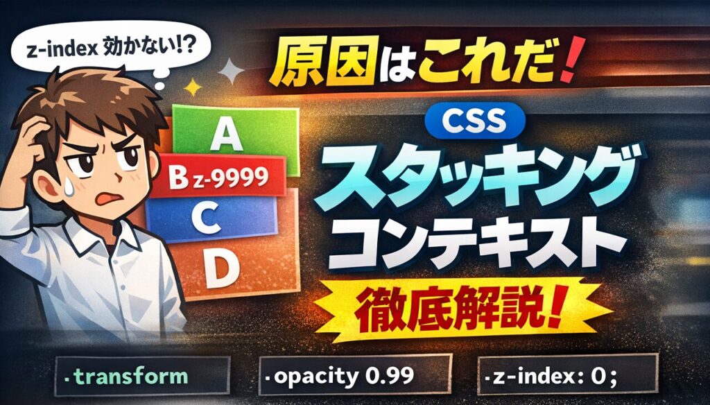 その原因の多くが スタッキングコンテキスト(stacking context) です。
