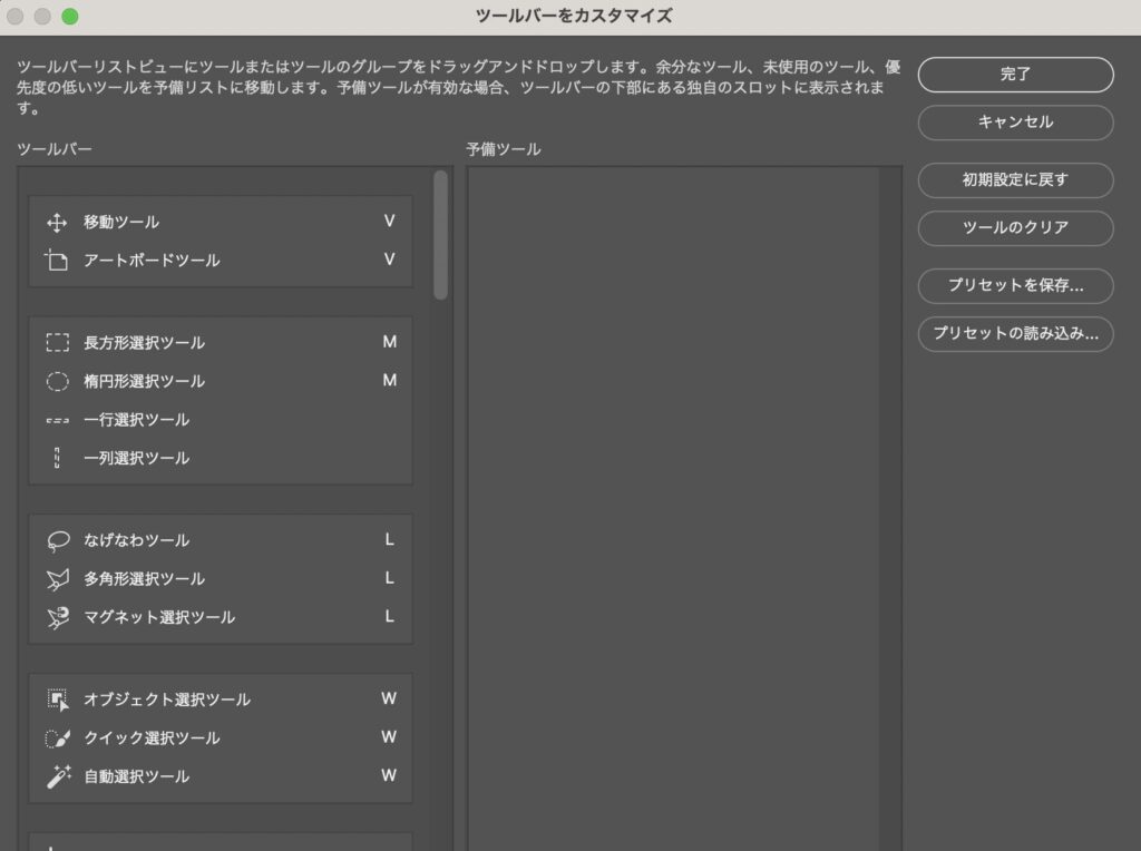 使用しないツールをツールバーから削除したり、よく使用するツールを追加することが可能です。